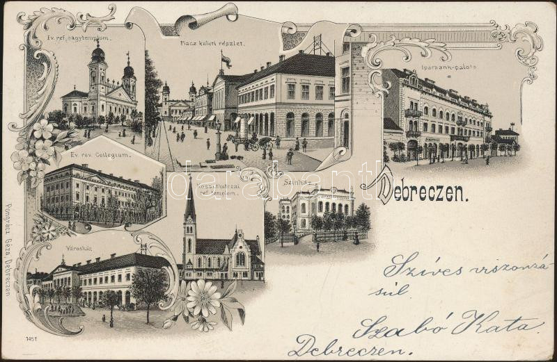 1899 Debrecen Nagytemplom, Református Kollégium, Iparbank palota, refo... https://www.darabanth.com/de/177-Fernauktion/177.0/Ansichtskarten/Ungarn~3300006/1899-Debrecen-Nagytemplom-Reformatus-Kollegium-Iparbank-palota-reformatus-templom-szinhaz-~II624087