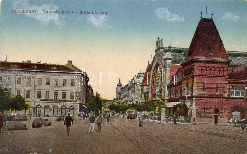 Beschreibung: Budapest IX. Vámház körút, a Nagyvásárcsarnok és a Koszorúszalag Nyomda, kávéház, villamosok (gluemark)