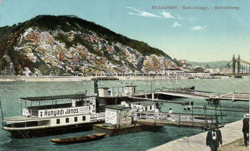 Beschreibung: Budapest XI. Gellérthegy, Lánchíd gőzös, rajta Hunyadi János keserűvíz reklámja