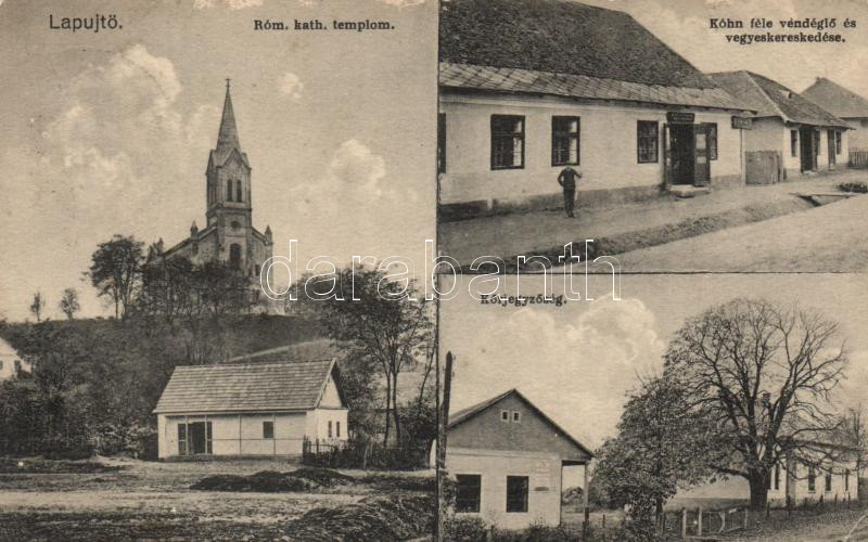 Beschreibung: Karancslapujtő Kohn vendéglője és vegyeskereskedése, körjegyzőség, római katolikus templom (EK)
