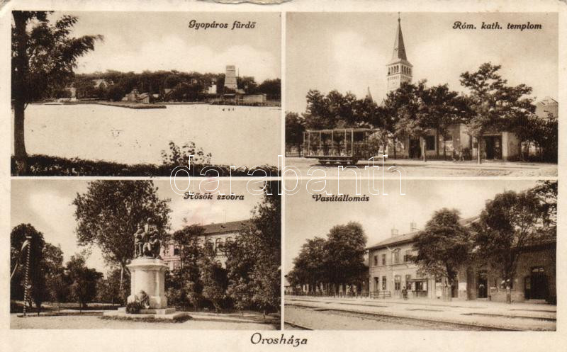 Orosháza vasútállomás, Gyopáros fürdő, római katolikus templom, Hősök ... https://www.darabanth.com/de/177-Fernauktion/177.0/Ansichtskarten/Ungarn~3300006/Oroshaza-vasutallomas-Gyoparos-furdo-romai-katolikus-templom-Hosok-szobra-EK~II622395