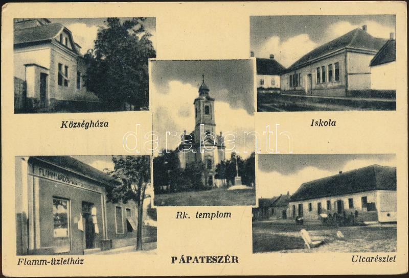 Pápateszér Flamm Sándor kereskedése, iskola, községháza, katolikus tem... https://www.darabanth.com/de/177-Fernauktion/177.0/Ansichtskarten/Ungarn~3300006/Papateszer-Flamm-Sandor-kereskedese-iskola-kozseghaza-katolikus-templom~II624023