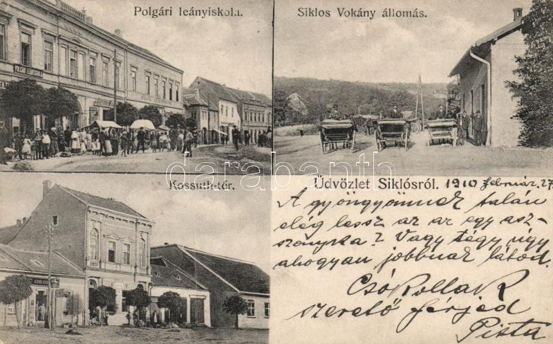 Beschreibung: Siklós polgári leányiskola, Steinbach József üzlete, Takarékpénztár, Vokány állomás, Kossuth tér, Kohn üzlete (EK)