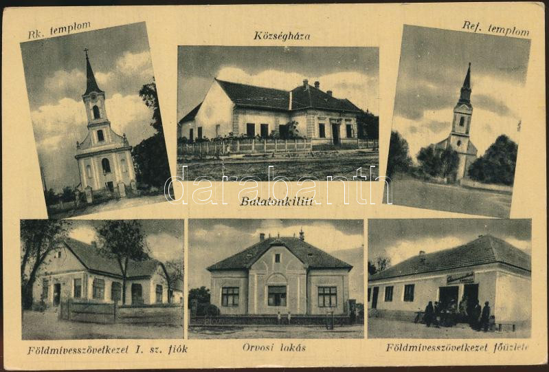 Beschreibung: Siófok-Balatonkiliti Földművesszövetkezet I. számú fiókja és főüzlete, orvosi lakás, községáhza, katolikus és református templom (EK)