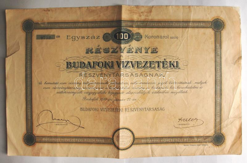 Budafok 1899. "Budafoki Vízvezetéki Részvénytársaság" részvénye 100K-r... https://www.darabanth.com/de/177-Fernauktion/177.0/Numismatik/Aktien-und-Tickets~3300026/Budafok-1899-Budafoki-Vizvezeteki-Reszvenytarsasag-reszvenye-100K-rol-Thajtott-szakadt~II624050