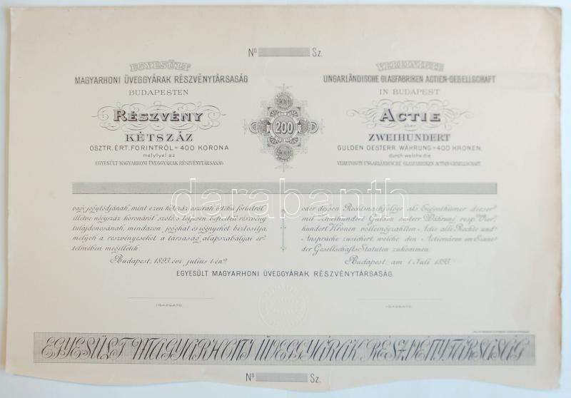 Beschreibung: Budapest 1893. "Egyesült Magyarhoni Üveggyárak Részvénytársaság Budapesten" részvénye 200 osztr. értékű forintról, kitöltetlen T:hajtatlan, két kis betépődés alul