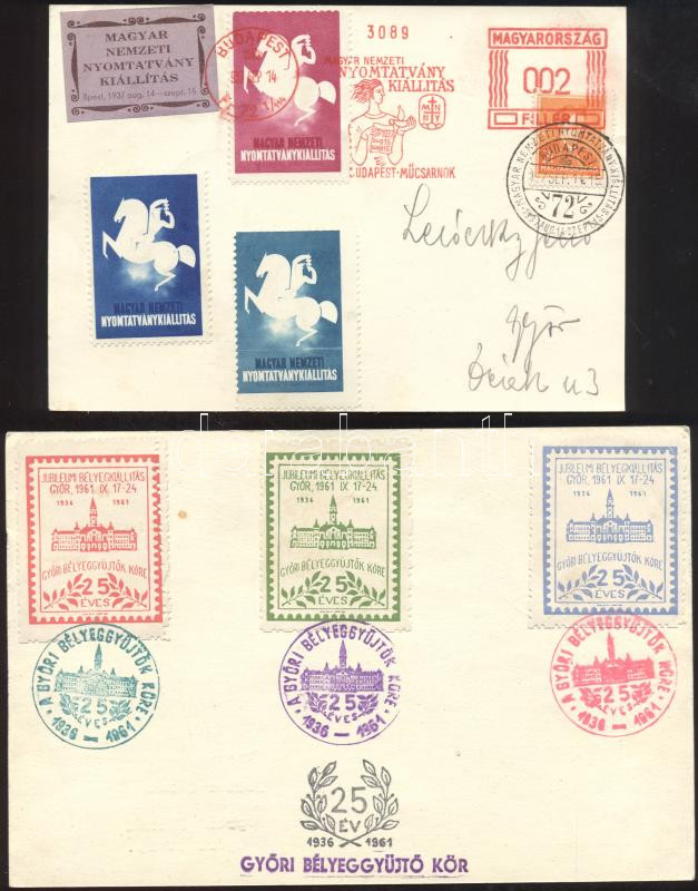 Beschreibung: 1937 Magyar Nemzeti Nyomtatvány Kiállítás emléklap + 1961 Jubileumi Bélyegkiállítás, Győr emléklap alkalmi levélzárókkal és bélyegzésekkel