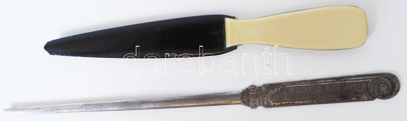 Beschreibung: 2 db jelzett levélbontó kés fémből és bakelitből, "Eisenwein és Pöstyén" felirattal/ Antique letter opener knife