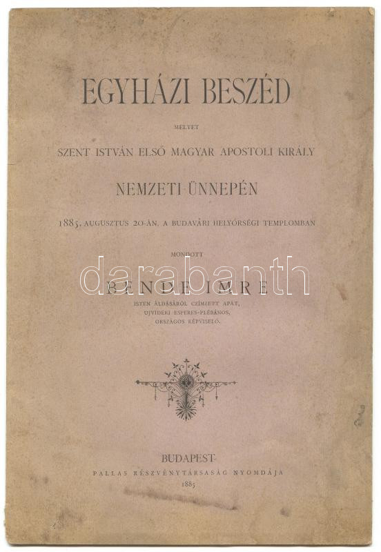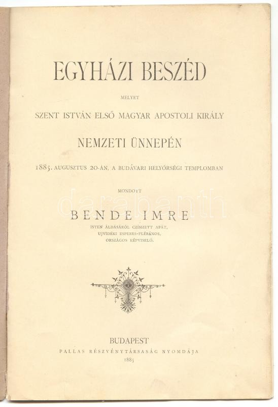 Egyházi beszéd, melyet az újvidéki esperes-plébános Bende Imre tartott a budavári helyőrségi templomban, Budapest, 1885, Pallas Részvénytársaság nyomdája, papírkötés