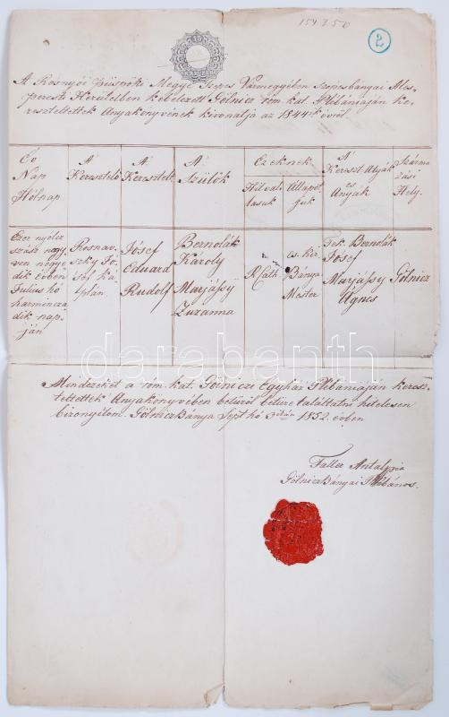 1852 Gölnicbányai anyakönyvi kivonat 15K szignettával, viaszpecséttel https://www.darabanth.com/de/178-Fernauktion/178.0/Andere-Sammelgebiete/Dokument~600157/1852-Golnicbanyai-anyakonyvi-kivonat-15K-szignettaval-viaszpecsettel~II624682