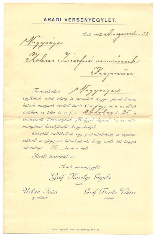 1902 Aradi Versenyegylet, "Hölgyek díjára" adomány hozzájárulást kérő ... https://www.darabanth.com/de/178-Fernauktion/178.0/Andere-Sammelgebiete/Dokument~600157/1902-Aradi-Versenyegylet-Holgyek-dijara-adomany-hozzajarulast-kero-level~II628256