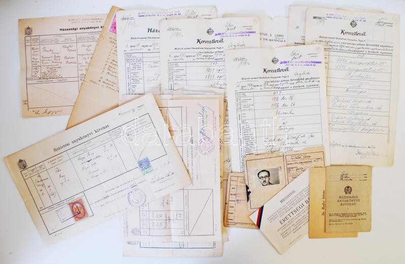 Beschreibung: Okmány tétel 1880-1950: Meghívók, anyakönyvi kivonatok, okmánybélyegekkel