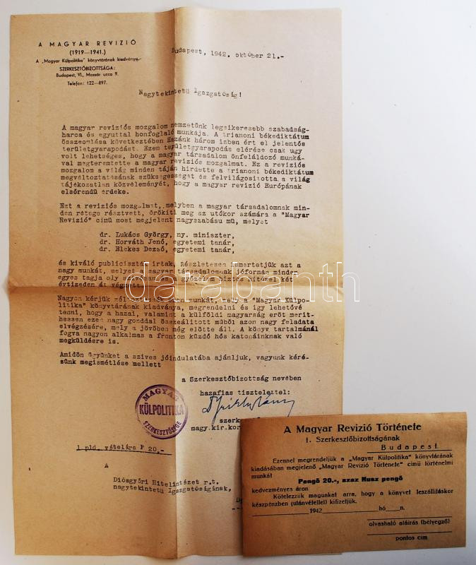 Beschreibung: 1942 A magyar revízió története 1919-1941 szerkesztőbizottságának a kiadványt propagáló levele, és hozzá csatolt megrendelő lapja