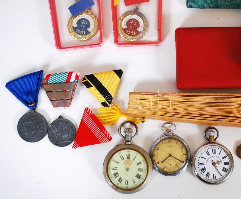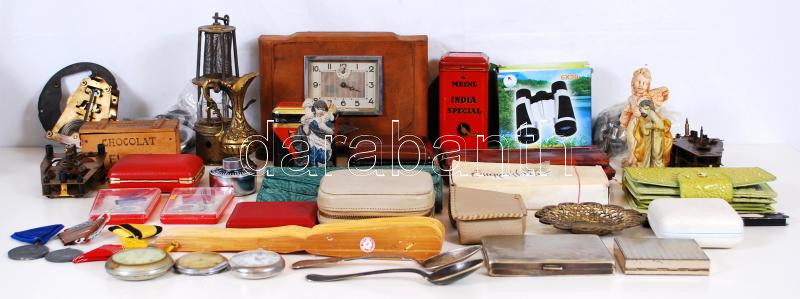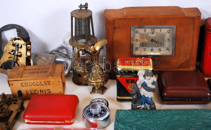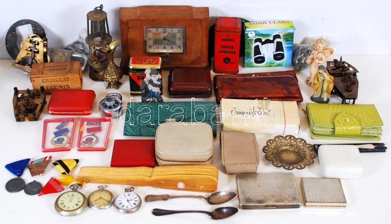 Beschreibung: Bolha tétel: Réz, bőr és kerámia tárgyak. Több fajta órák, kitüntetések, távcső, legyező, stb