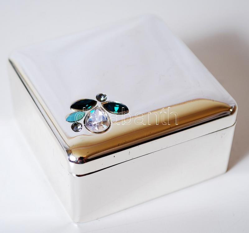 Beschreibung: Swarovski üveges ékszertartó fém dobozka, 6×6 cm, m:3 cm / metal mini box with Swarovski glass
