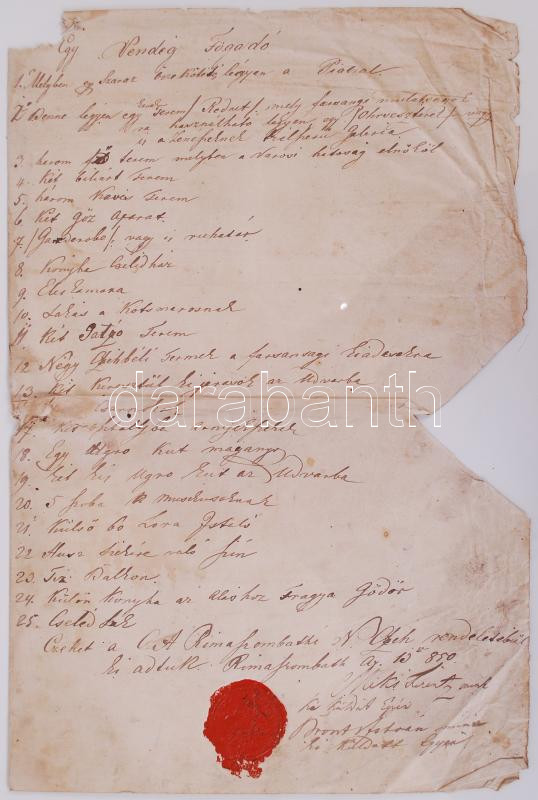 Beschreibung: 1850 Rimaszombati céh leírása a piac mellé tervezett fogadó elrendezéséről és kellékeiről, kissé sérült viaszpecséttel