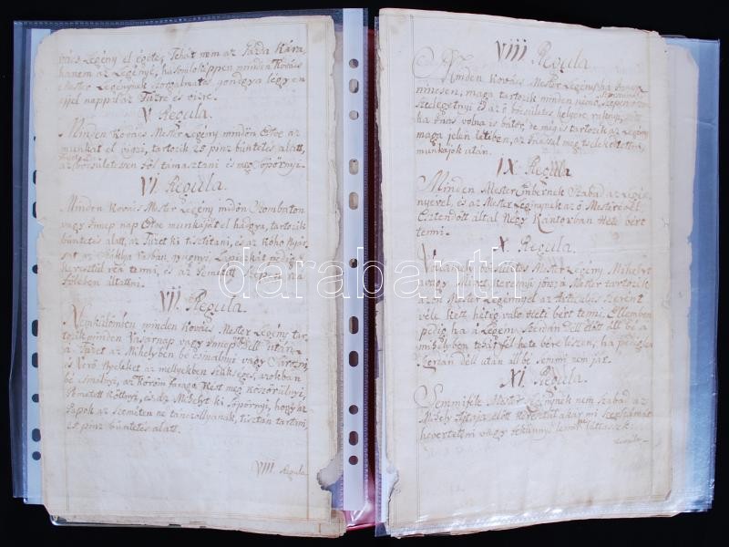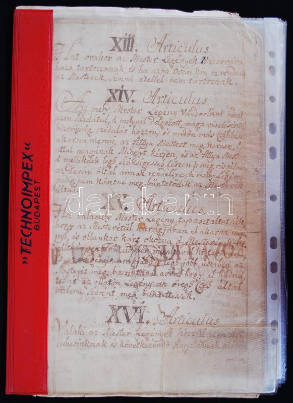 cca 1700 A karádi (Somogy megye) kovács, asztalos, lakatos és kerékgyártó céh szabályai magyar nyelven. Hiányosan, lapokban, végén viaszpecséttel 12 kézzel beírt oldal