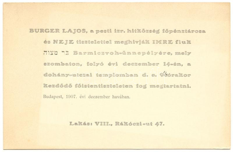 1907 Burger Lajos a pesti izr. hitközség főpénztárosának meghívója fiú... https://www.darabanth.com/de/178-Fernauktion/178.0/Andere-Sammelgebiete/Judaica~600001/1907-Burger-Lajos-a-pesti-izr-hitkozseg-fopenztarosanak-meghivoja-fiuk-Bar-micva-unneps~II592763