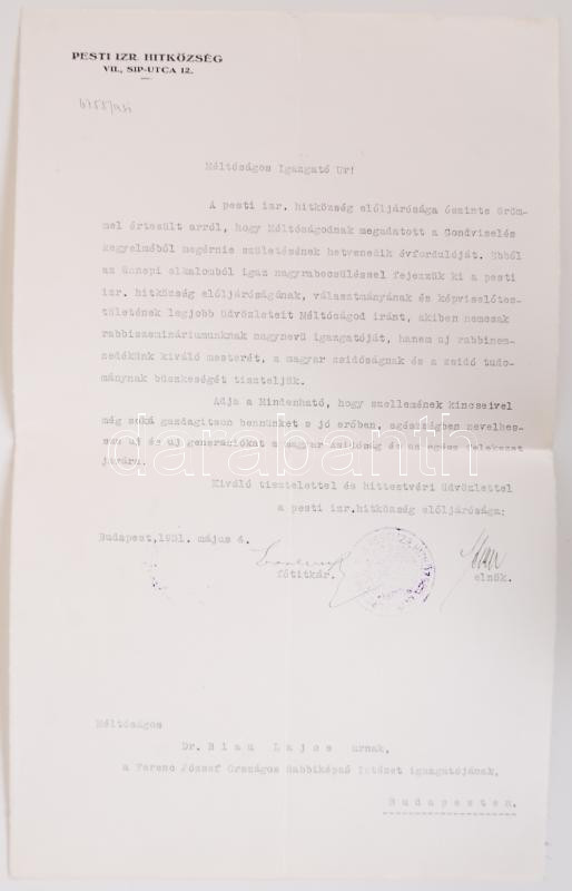 1931 A Pesti Izraelita Hitközség gratuláló levele Blau Józsefnek 70. s... https://www.darabanth.com/de/178-Fernauktion/178.0/Andere-Sammelgebiete/Judaica~600001/1931-A-Pesti-Izraelita-Hitkozseg-gratulalo-levele-Blau-Jozsefnek-70-szuletesnapjara-Alai~II604815