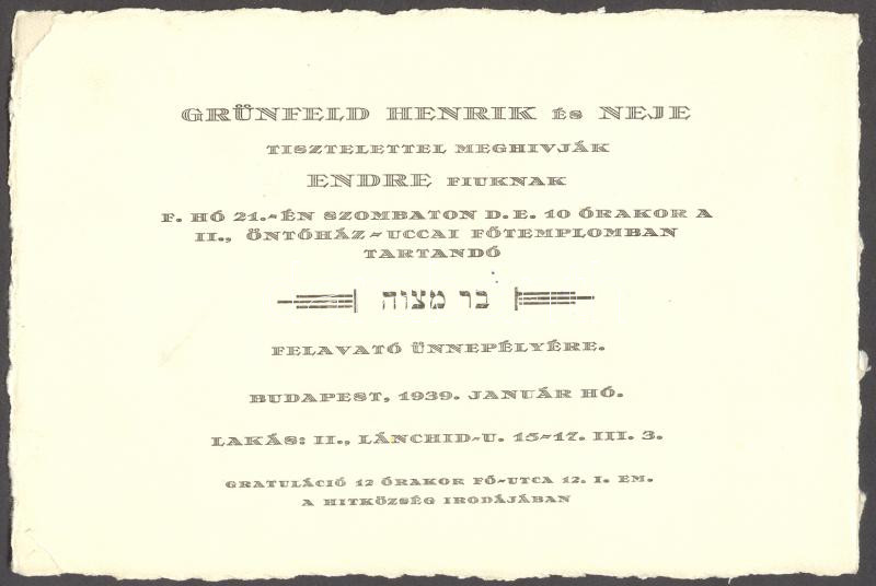 1939 Meghívó az II. Öntőház utcai zsinagógába Bár micvó ünnepségre https://www.darabanth.com/de/178-Fernauktion/178.0/Andere-Sammelgebiete/Judaica~600001/1939-Meghivo-az-II-Ontohaz-utcai-zsinagogaba-Bar-micvo-unnepsegre~II604864