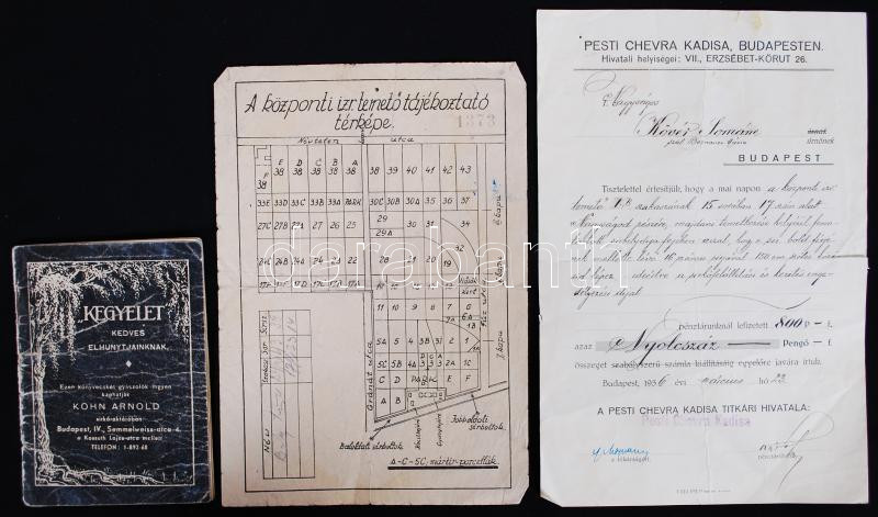 Beschreibung: cca 1940 A központi izraelita temető tájékoztató térképe, Kegyeleti könyv és Chevra Kadisa okmány
