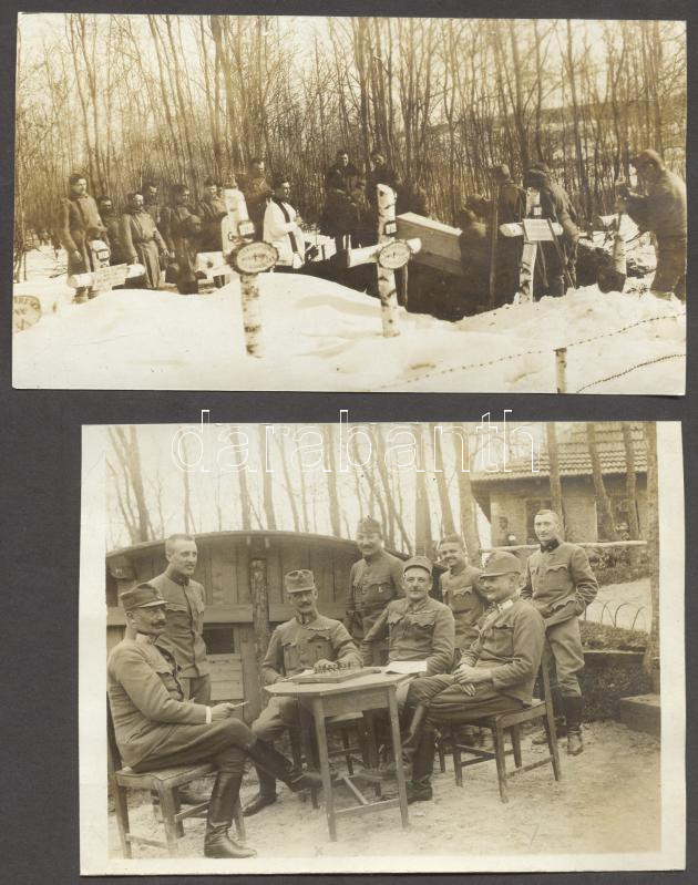 Beschreibung: cca 1916, 2 db fotó az orosz frontról, Szász Ágost és a tisztikar, katona temetés,