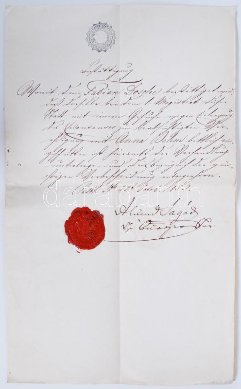 Beschreibung: 1850 15K szignetta a pesti polgármester pecsétjével kézzel írt, német nyelvű okiraton