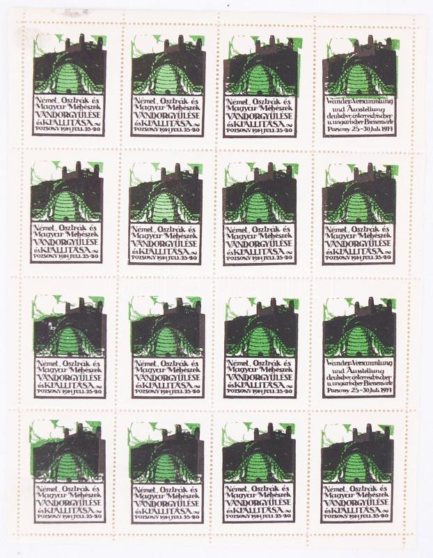 Beschreibung: 1914 Méhész vándorgyűlés és kiállítás levélzáró, kétnyelvű, zöld, 4x4-es kisív