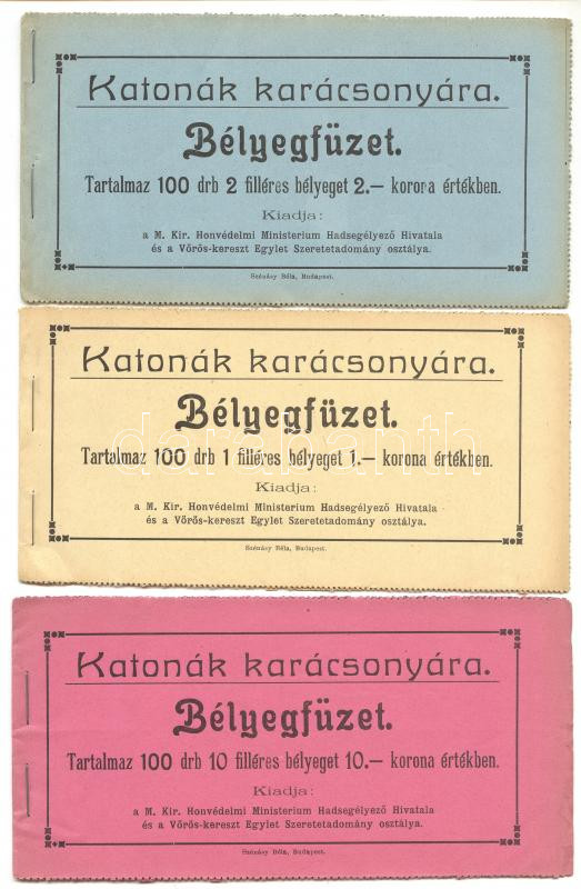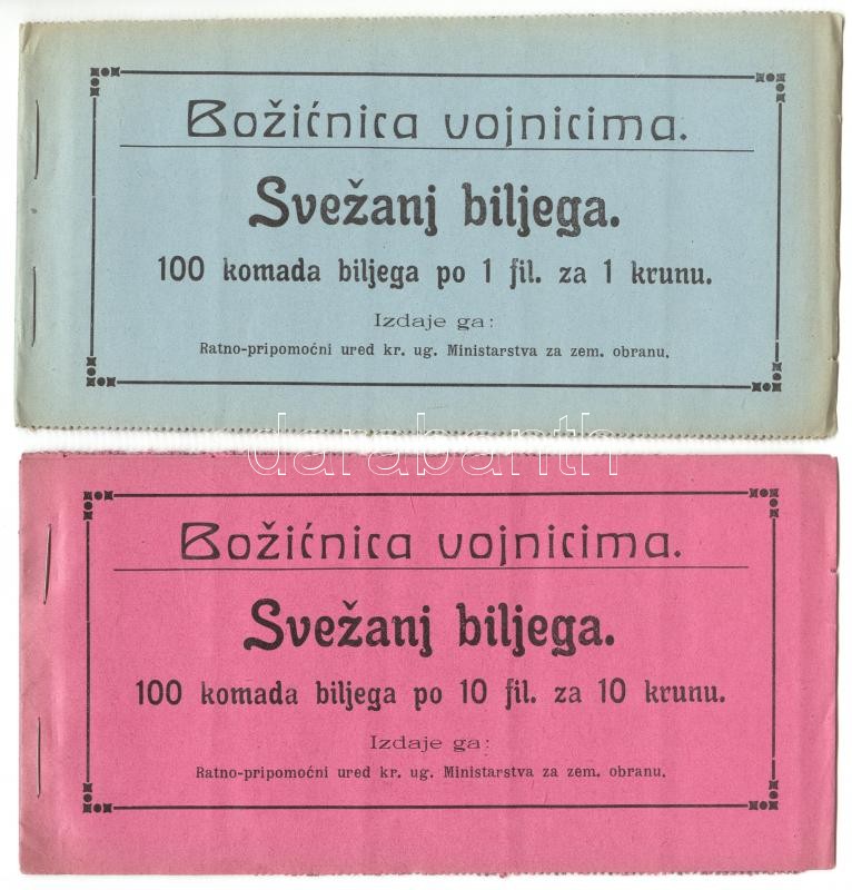 Beschreibung: 1915 Katonák Karácsonyára segélybélyeg 100 db-ot tartalmazó teljes füzetek 5 db 1,2,10f magyar és 1f,10f horvát
