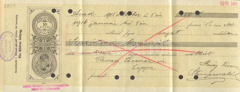 1916 Aradi Polgári Takarékpénztár RT. váltó, 10 fillér, okmánybélyegek... https://www.darabanth.com/de/178-Fernauktion/178.0/Andere-Sammelgebiete/Paraphilatelie~600024/1916-Aradi-Polgari-Takarekpenztar-RT-valto-10-filler-okmanybelyegekkel~II626883
