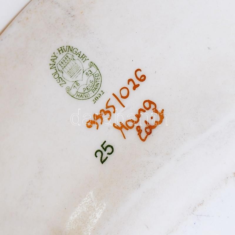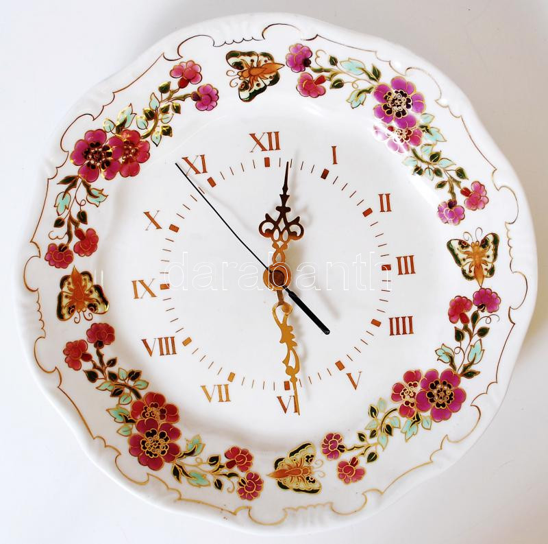 Kézzel festett számozott virágokkal díszített jelzett Zsolnay porcelán falióra, a festő "Mang Edit" aláírásával, hibátlan állapotban/ Handpainted numbered Zsolnay chinaware vase with the painter's "Mang Edit" signature in flawless condition d:26 cm