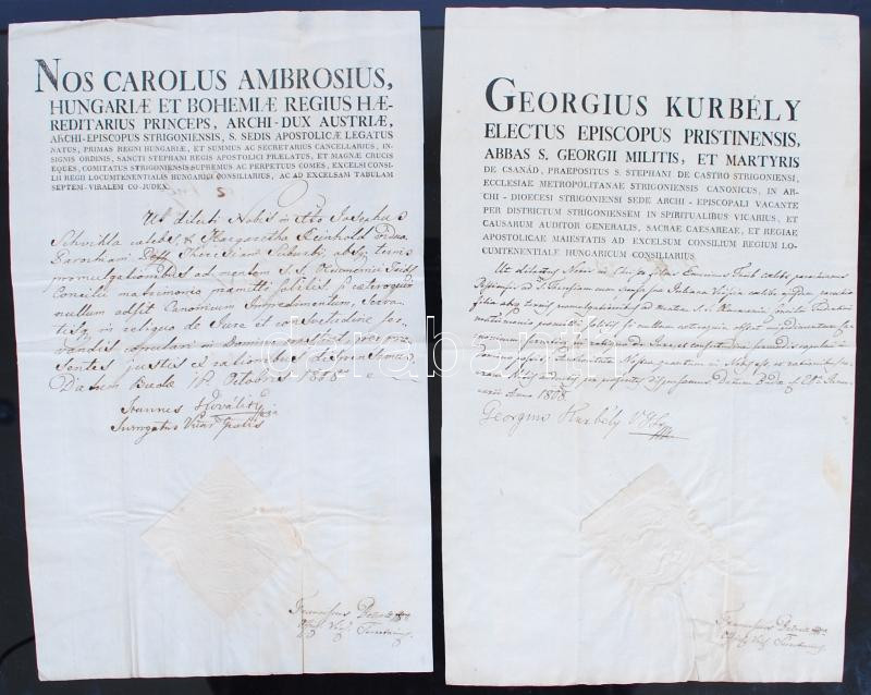 Beschreibung: 1808 Kurbély György és Kovalik János püspökök aláírásai okiratokon püspöki szárazpecsétekkel