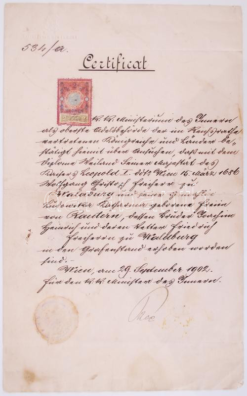 1902 Dokumentum az osztrák belügyminiszter saját kezű aláírásával /