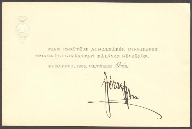 1924 József főherceg aláírása, fia esküvői meghívóján/ Joseph August V... https://www.darabanth.com/de/178-Fernauktion/178.0/Andere-Sammelgebiete/Signatur~600030/1924-Jozsef-foherceg-alairasa-fia-eskuvoi-meghivojan-Joseph-August-Viktor-Klemens-signat~II626746