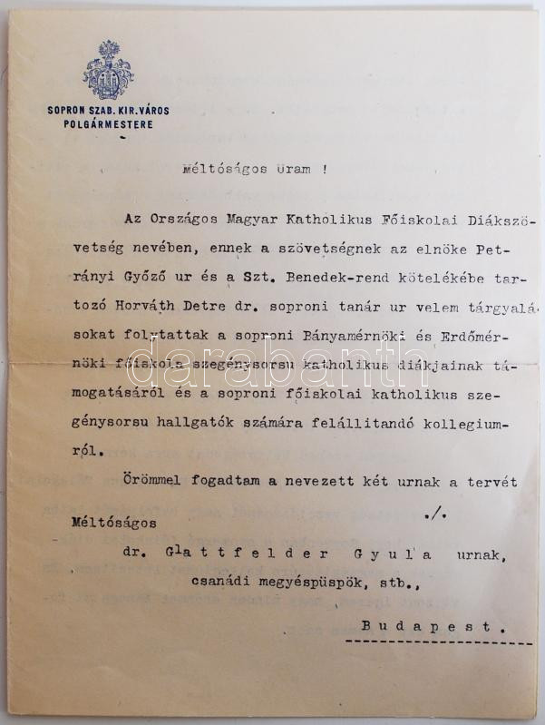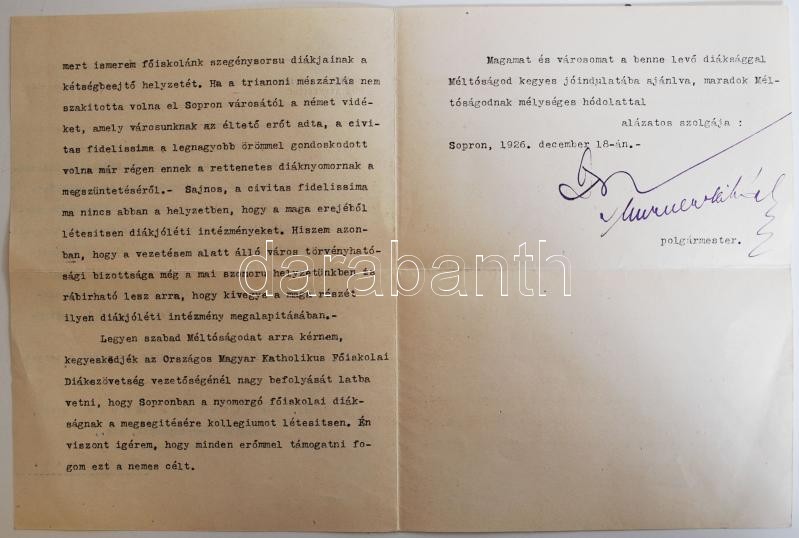 Beschreibung: 1926 A soproni polgármester, Thurner Mihály (1878-1952) levele Glattfelder Gyula csanádi megyéspüsöknek fejléces papíron, aláírásával