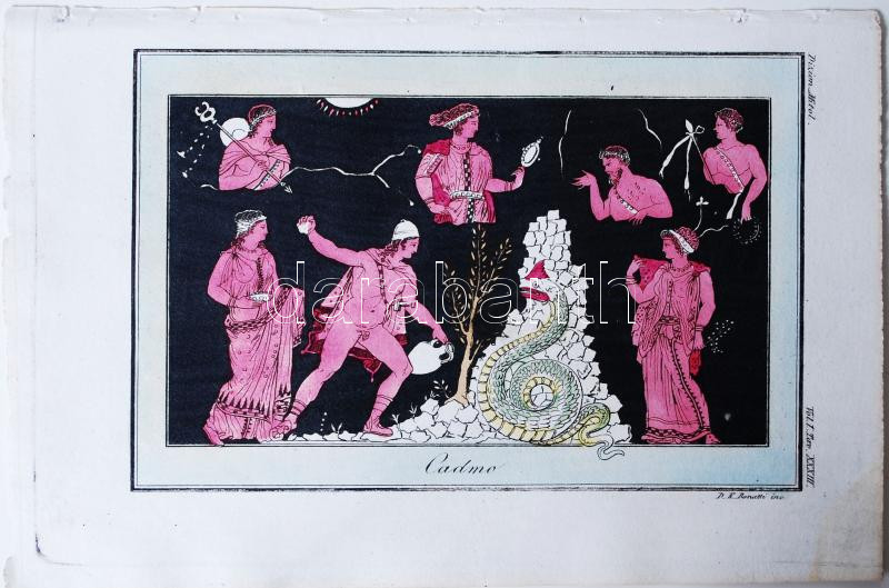 Girolamo Carattoni: Cadmo. Színezett acélmetszet az 1823-ban Milánóban kiadott Dizionario d'ogni mitologica e antichita vol. I illusztrációi közül, 15x23 cm