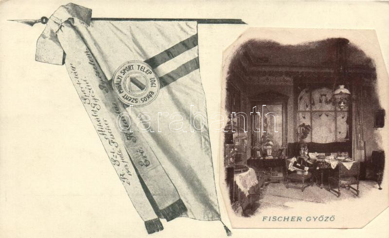 A Rákosszentmihályi Sporttelep zászlója, a képeslapon egy másik képeslapról származó felragasztott részlet, valamint bélyeg / The flag of the sport club of Rákosszentmihály, glued stamp and postcard element from an other postcard