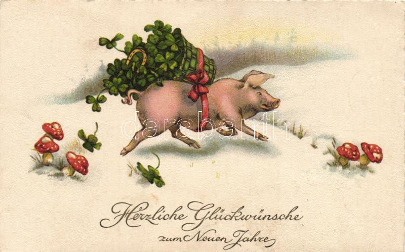 New Year, pig, clover, mushroom, horseshoe, litho (EK) https://www.darabanth.com/de/178-Fernauktion/178.0/Ansichtskarten/GruC39Fkarte~600125/New-Year-pig-clover-mushroom-horseshoe-litho-EK~II624435