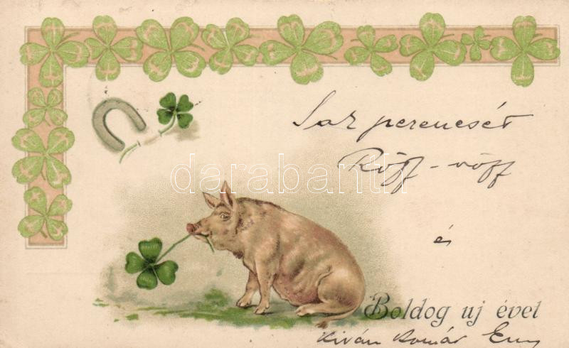 1899 New Year, pig with clovers and horseshoe, litho (b) https://www.darabanth.com/de/178-Fernauktion/178.0/Ansichtskarten/Lots-im-Letzte-Minute~600137/1899-New-Year-pig-with-clovers-and-horseshoe-litho-b~II624449