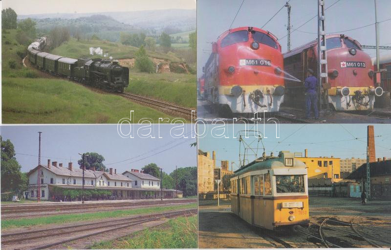 37 db modern, használatlan, közlekedéssel kapcsolatos képeslapok, 29 vonat, 4 vasútállomás, 3 villamos és egy hajó / 37 modern, unused postcards, 29 trains, 4 railway stations, 3 trams and one ship