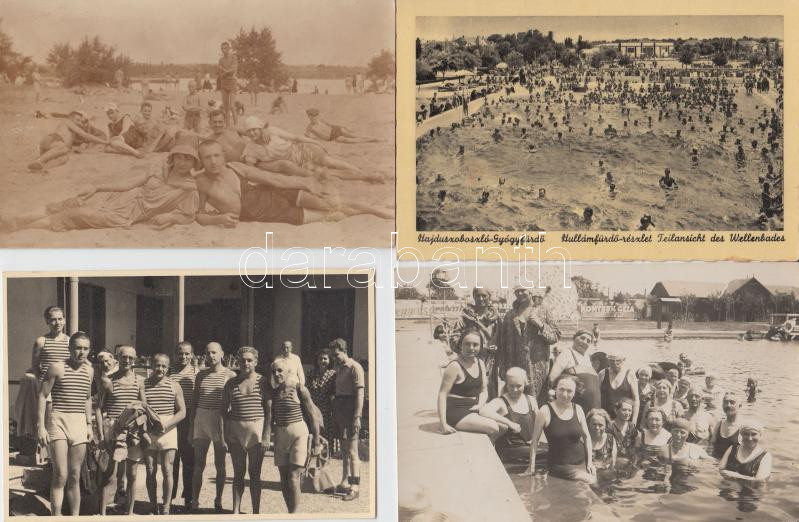 10 db régi képeslap, 5 magyar fürdőhelyekről, és 5 fotólap a fürdőéletről, érdekes fürdőruhák / 10 postcards, 5 Hungarian postcards about beaches, and 5 photo cards about people on the beach, interesting bathing clothes