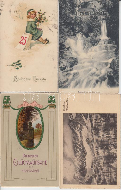 Beschreibung: 30 db régi vegyes tematikájú képeslap, főként üdvözlőlapok és külföldi városképes lapok, közte lithok is