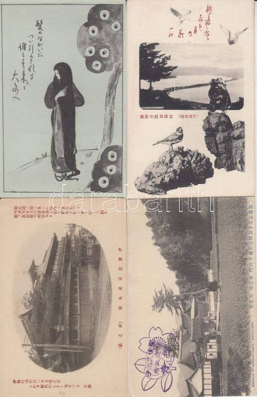 45 db régi japán képeslap, főleg vallással kapcsolatos és természetképes lap, néhány művészlap és egy leporello / 45 Japanese postcards, mainly temples and landscapes, some artist cards and one leporello