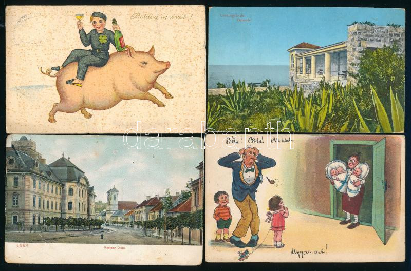 Beschreibung: Több mint 200 db háború előtti képeslap: magyar és külföldi városképek, üdvözlő és motívum lapok. Érdekes vegyes anyag, vegyes minőségben.