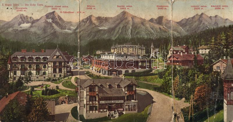 Beschreibung: Tátra panoramacard, the shop of Tódor Kertész, café, Divald & Monostory (b)