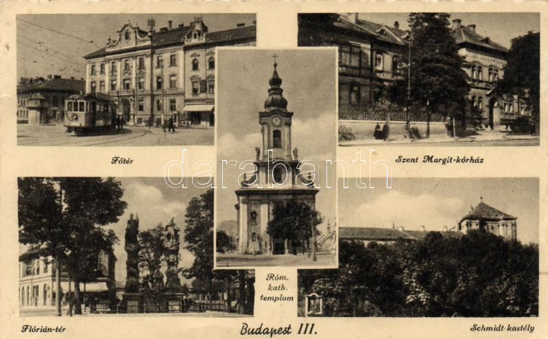 Budapest III. Óbuda; Szent Margit Kórház, Flórián tér, Schmidt-kastély https://www.darabanth.com/de/178-Fernauktion/178.0/Ansichtskarten/Ungarn~300004/Budapest-III-Obuda-Szent-Margit-Korhaz-Florian-ter-Schmidt-kastely~II627786
