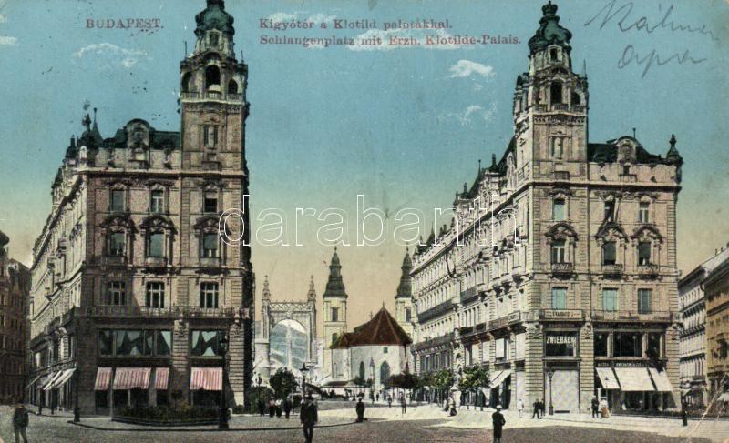 Beschreibung: Budapest V. Kígyó (Ferenciek) tér Klotild palotákkal, Zwieback üzletével (EB)