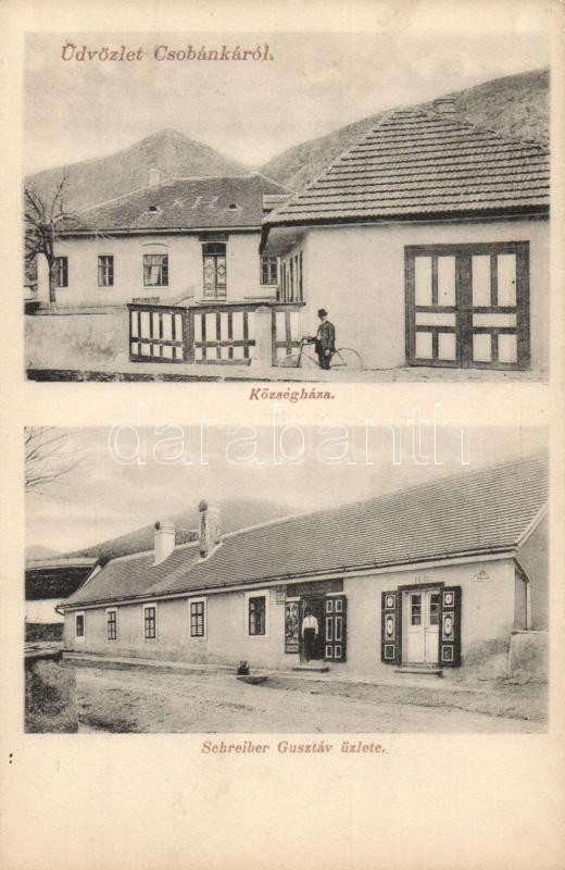 Csobánka Schreiber Gusztáv üzletével https://www.darabanth.com/de/178-Fernauktion/178.0/Ansichtskarten/Ungarn~300004/Csobanka-Schreiber-Gusztav-uzletevel~II628160