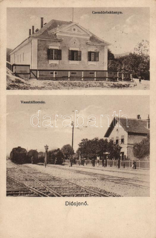 Diósjenő csendőrlaktanya és vasútállomás https://www.darabanth.com/de/178-Fernauktion/178.0/Ansichtskarten/Ungarn~300004/Diosjeno-csendorlaktanya-es-vasutallomas~II629054