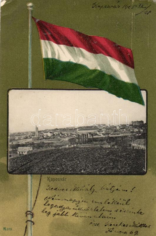 Kaposvár magyar zászlóval, litho (EK) https://www.darabanth.com/de/178-Fernauktion/178.0/Ansichtskarten/Ungarn~300004/Kaposvar-magyar-zaszloval-litho-EK~II624496